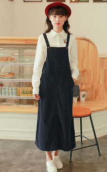 白衬衫上精致的小动物绣花,瞬间让衬衣明亮起来,搭配灯芯绒背带裙,文艺范十足。