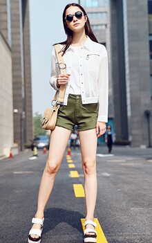 街头风帅气小翻领网纱短外套,搭配全棉打底衫和磨边牛仔热裤+厚底凉鞋+小猪包,轻松搞定末春出街风尚