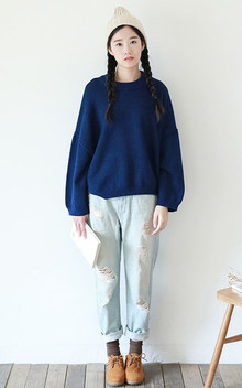 套头小领毛衣,大大的袖子很文艺,喜欢这种干净的纯色套头衫,搭配破洞牛仔裤,慵懒随性。