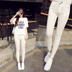 时尚的条纹T恤,修身的剪裁,简约的风格也能穿性感的气质,搭配白色的休闲裤,女人味十足!
