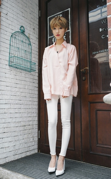 宽松的衬衫,翻领的设计,穿着休闲随意,一点不挑人,搭配白色小脚裤,穿一双粗跟尖头鞋,独特个性!
