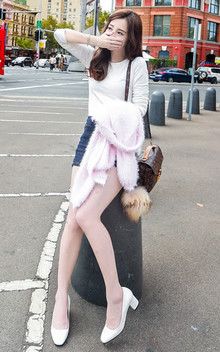 嫩嫩的粉色开衫外套,毛茸茸的质感,让你更萌更可爱,内搭后背交叉带设计白色T恤,下着牛仔短裤,青春时尚,甜美可人