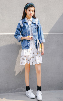 春季牛仔外套不可缺少,这款磨毛破洞款牛仔外套,宽松休闲,有些小嬉皮感,内搭趣味猫头鹰印花雪纺裙,增添柔美感,很时尚
