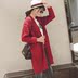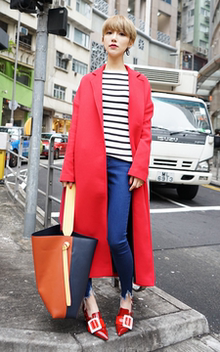 长款风衣外套,翻领的设计,版型很好,大气的红色,格外抢眼,内搭条纹T恤,下身搭配小脚裤,个性十足!