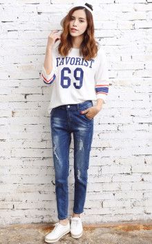 字母印花t恤,宽松的版型,休闲又舒适,搭配破洞牛仔裤,清爽又大方。