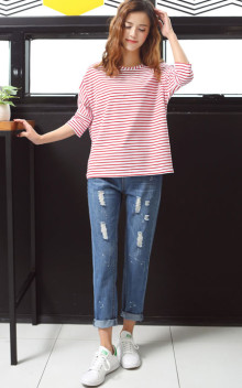 清新可爱的红白条纹短袖T恤,简洁清爽非常舒适哦,搭配破洞款白色小脚裤,尽显青春活力,休闲舒适。
