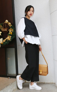 oversize版型的西装马甲,搭配清新的白我娃娃衫,下搭九分设计的宽腿裤,休闲时尚