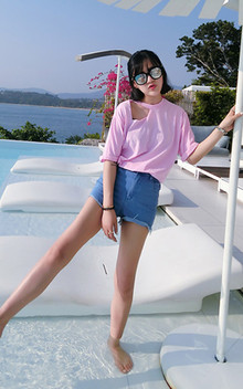 这款T恤很有设计感,领子一边是挖空的,露出你精致的锁骨,休闲款很好穿,搭配毛边热裤和墨镜很时尚