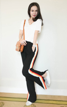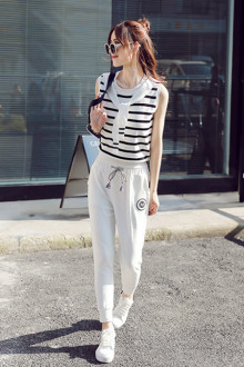 干净的白色T恤,没有多余的装饰,上身效果很棒,搭配休闲长裤,侧面条纹的设计,尽显时尚气质。