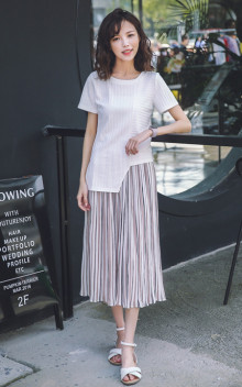 时尚条纹T恤,冰丝感的面料,穿着舒适凉爽,搭配休闲阔腿裤,百褶的设计,轻松遮肉显高挑!