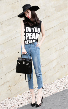 宽松的无袖T恤,潮流的字母印花,充满时尚感,上身很不错,搭配紧身牛仔裤,不规则裤腿,个性凸显。