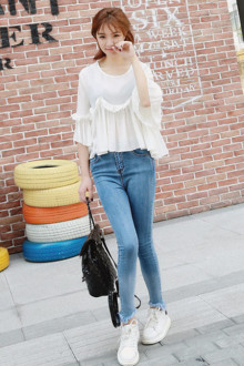 白色短袖T恤,干净的款式,胸前的水果印花,俏皮可爱,搭配修身牛仔裤,膝盖破洞,尽显韩版风范!