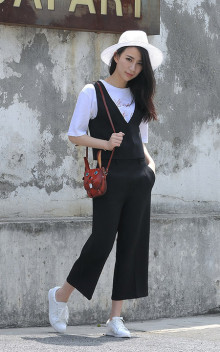 简约气质的纯色马甲背心显瘦阔腿裤两件套装,搭配小白鞋和镂空草帽加上手工包,添个性