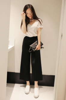 很偷懒的搭配,简单的T恤加阔腿裤,可是偷懒却讲究技巧,流苏吊坠式T恤就是简单中的不平凡哦。