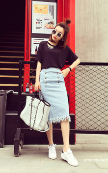 这潮t,前领镂空剪裁设计更是点睛之笔,又有小坠子做装饰,更显精致可爱,版型显瘦,搭配摩登时尚磨边条纹排口牛仔半身裙很时尚