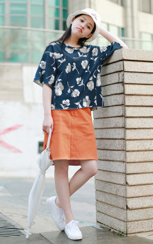 宽松的短袖T恤,唯美的印花,上身清新自然,搭配纯色半身裙,橘色有春天的味道,很有韵味。