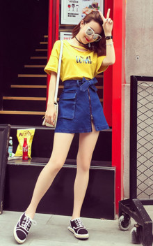 很洋气的一款吊带连衣裙,时尚单排扣+前开叉设计,腰间系带,很有范的牛仔裙,内搭字母T恤,韩范十足,尽显街头潮范