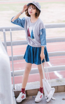 很酷很个性牛仔袖拼接设计T恤,七分袖长度,宽松休闲,非常洋气有范,下搭宽松阔腿牛仔短裤,尽显青春学院风。
