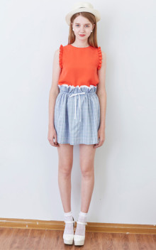 活泼可爱,充满热情活力的橙色T恤,可爱的木耳边装饰,增添俏皮甜美感,搭配条高腰抽褶设计格纹半身裙,清爽有活力。
