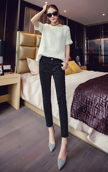 舒适圆领T恤,套头的款式,穿着很休闲的一件,搭配黑色的小脚裤,清新淡雅,美观又大方。