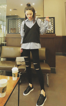 极简主义设计的套装,精美衬衫+背心两件套哦,搭配小脚裤非常的显瘦显腿长。完美勾勒出小女人性感优雅气质!