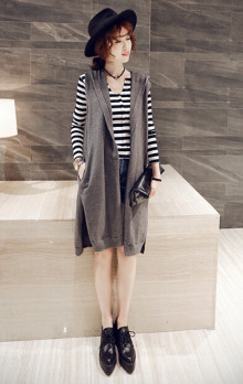 无袖设计,很休闲的一件外套,针织面料,大大口袋设计,作为外套,时尚范儿十足,下身搭单裤或者打底裤都很漂亮。