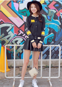 条纹M字母棒球服是现在时代流行元素,皮裙也是经典不衰的时尚单品,整一身紧跟潮流,时尚大方而又不是可爱。