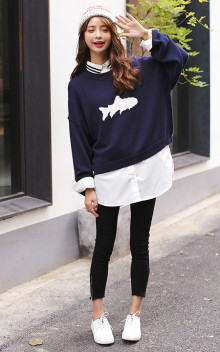 非常可爱的卡通小鲸鱼图案针织衫,大方的圆领,百搭藏蓝色,穿着很可爱,内搭件小翻领长款衬衫,配上牛仔长裤,尽显青春活力