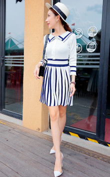 编辑君喜欢这样的学院风,即便早已过了这样的年纪,偶然扮嫩也是不错的选择。纯色t搭配条纹背心裙真心很甜美哦!