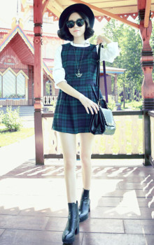 格子拼接娃娃衫。,秋冬季节百搭单品,适合甜美可爱的MM,灯笼袖的设计更是公主范十足,搭配破洞铅笔裤,时尚潮范