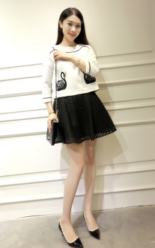 可爱的小鹿图案,在红色的衣服上,休闲的感觉,下身一条黑色百褶裙,尽显文静优雅的气质。