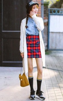 清新BF风牛仔蓝衬衫,穿着利落又有些小帅气,搭配经典红蓝格纹半身包臀裙,充满学院风情,外披件针织开衫,完美度过秋日