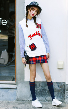 简约休闲风的字母短款卫衣,外罩一件极具学院气质的V领针织小背心,很洋气很青春,搭配格子短裙,配双休闲鞋,尽显青春活力。