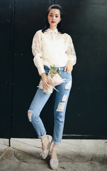 透视翻领上衣,可爱的蝴蝶提花,搭配浅蓝色破洞牛仔长裤,极致个性,大气复古!