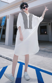 宽松条纹连衣裙,设计感十足的落肩款,搭配撞色拼接滑板鞋,极致复古显瘦,欧美街头范!