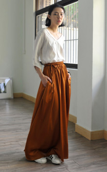 休闲的白色棉麻T恤,下摆系带的设计,胖瘦都可以穿,搭配上纯色的半身裙,充满复古情调,文艺又清新,时尚百搭。