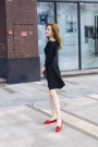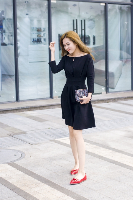 简约的一字领,收腰款设计,穿起来特别显瘦,百褶的裙摆,搭配一双红色的小单鞋,简约又气质,挎一款精致的小包,美美哒小香风!