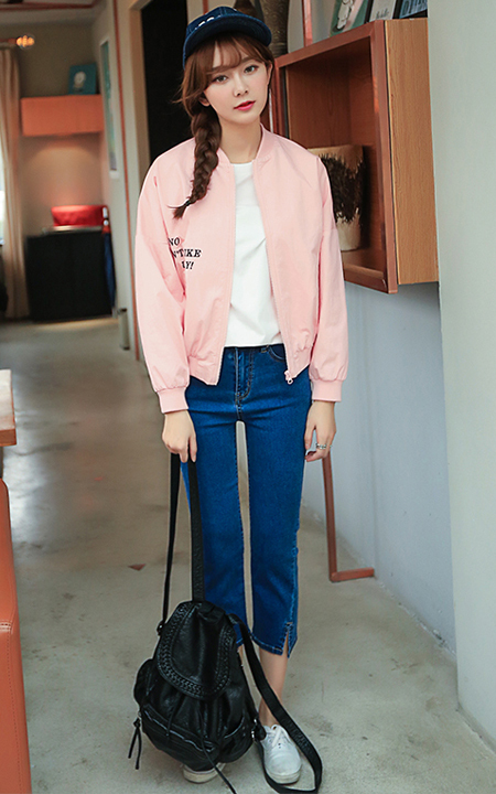 简洁样式的短款外套,宽松蝙蝠袖样式,上身很时尚很洋气,尽显青春活力,内搭T恤,下搭裤脚开叉设计九分牛仔裤,青春可爱