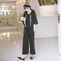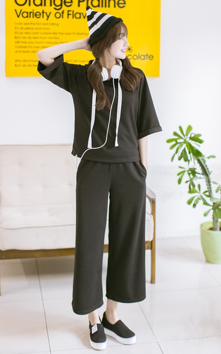 韩范运动休闲套装,青春活力的连帽卫衣,搭配宽宽松松的休闲裤,时髦的黑白条纹针织帽、笑脸乐福鞋,唯美的演绎了运动女孩的魅力