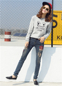 经典的灰色卫衣,趣味的猫咪印花~可爱又时髦,搭配红唇潮流磨破牛仔裤,瞬间提升了时尚感,这样穿心情棒棒哒~