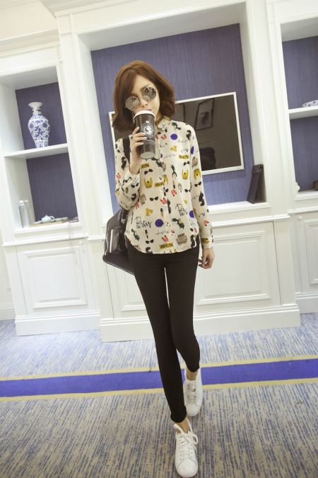 衣身印花图案趣味十足,,现代都市女人的摩登与时尚。搭配纯色长裤,中腰的非常显瘦,很多年龄段都可以尝试的搭配