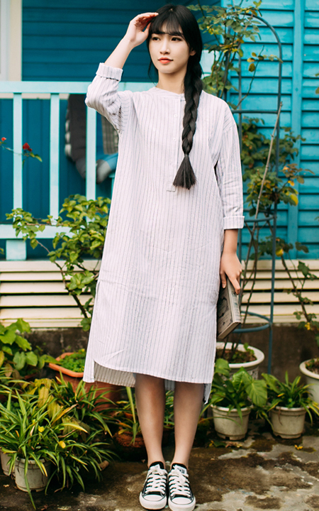 简洁大方的衬衫式连衣裙,时尚竖条纹,下摆开叉设计,复古小立领,知性淑女又有些小帅气感,搭配双帆布鞋,尽显文艺小清新范