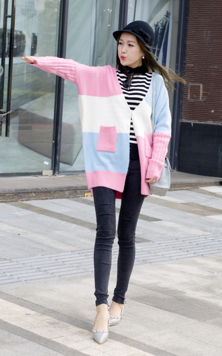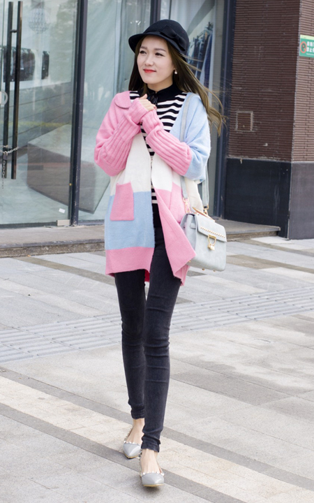 彩虹色的针织外套,搭配基础版的修身牛仔裤,宽松的针织衫,修身的小脚裤设计,穿起来很显瘦,搭配质感超好的包包和单鞋~美!