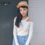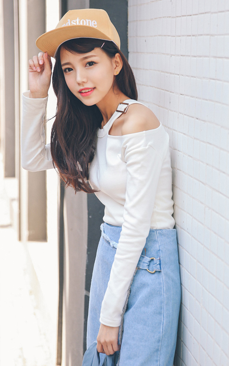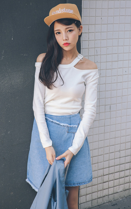 很有设计感的一字斜肩设计T恤,让你香肩小露,尽显女人魅力,修身好搭,配条不规则设计毛呢牛仔半身裙,非常的时尚迷人