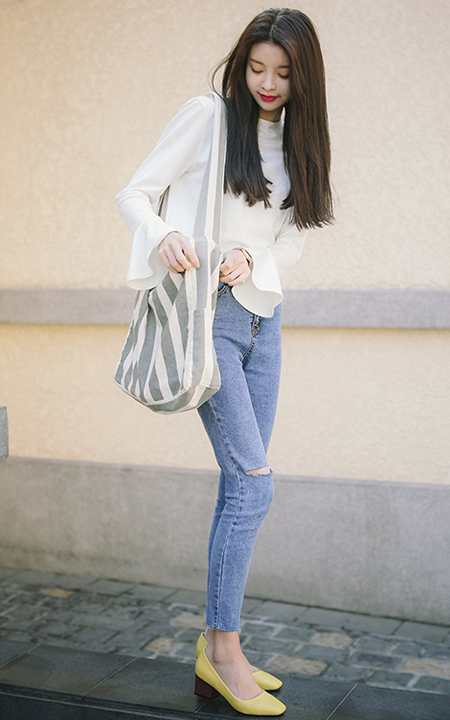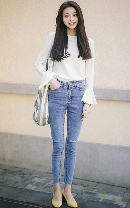 经典水洗破洞牛仔裤,高腰修身显瘦,九分小脚设计,非常百搭。搭配圆领喇叭袖T恤,街拍韩范儿。