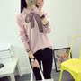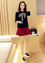翻领+蝴蝶结的套头毛衣哟,黑色超级显瘦得说,想要甜美还有粉色呢,搭配高腰a字裙,拉长了身体比例,穿双乐福鞋出游吧