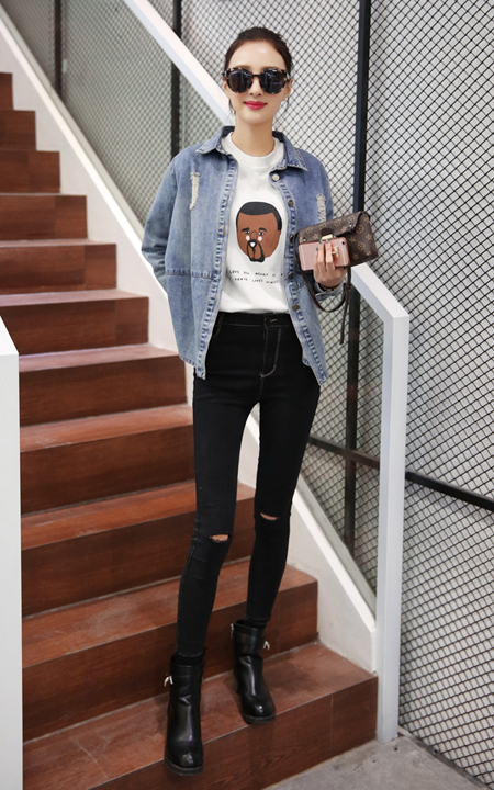 很不错的一款牛仔外套,后部弧形下摆,上身很干练,内搭纯棉T恤,搭配一条黑色小脚裤,韩范儿十足!
