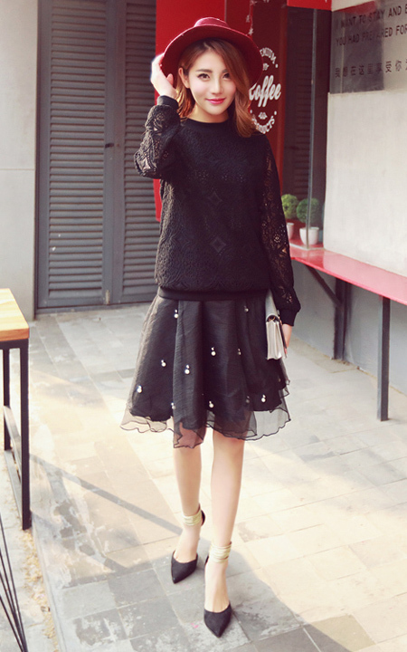 超级好看的吸睛蕾丝T恤+短裙套装,蕾丝钩花仙女又浪漫哦,搭配尖头高跟鞋时尚又好看~