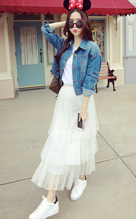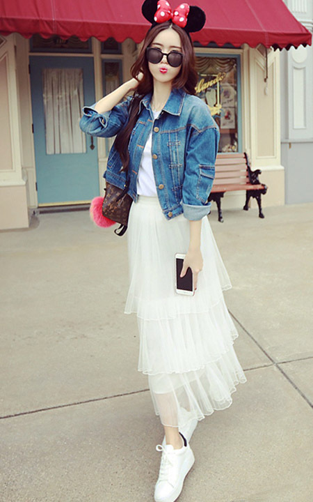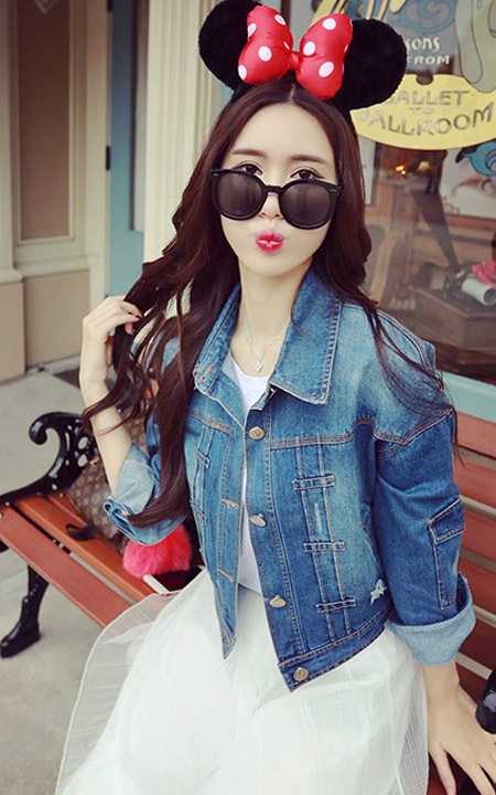 春季一定要有这样的短版牛仔外套,背后刺绣图案的设计非常有创意,搭配半身长裙,简约又大方
