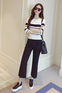 很修身的条纹针织衫哟,白色底条纹的部位特别显胸呀~超性感的搭配高腰阔腿九分裤,有收腰的感觉,s曲线你懂的~